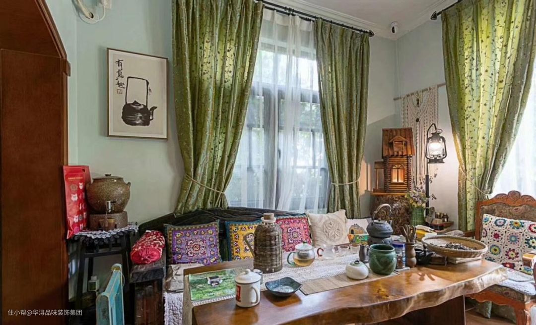 在客厅中使用绿色作为底色、上面缀满浅绿色小碎花的窗帘就挂在两个窗户前,十分的显眼,给人扑面而来的乡土风情。