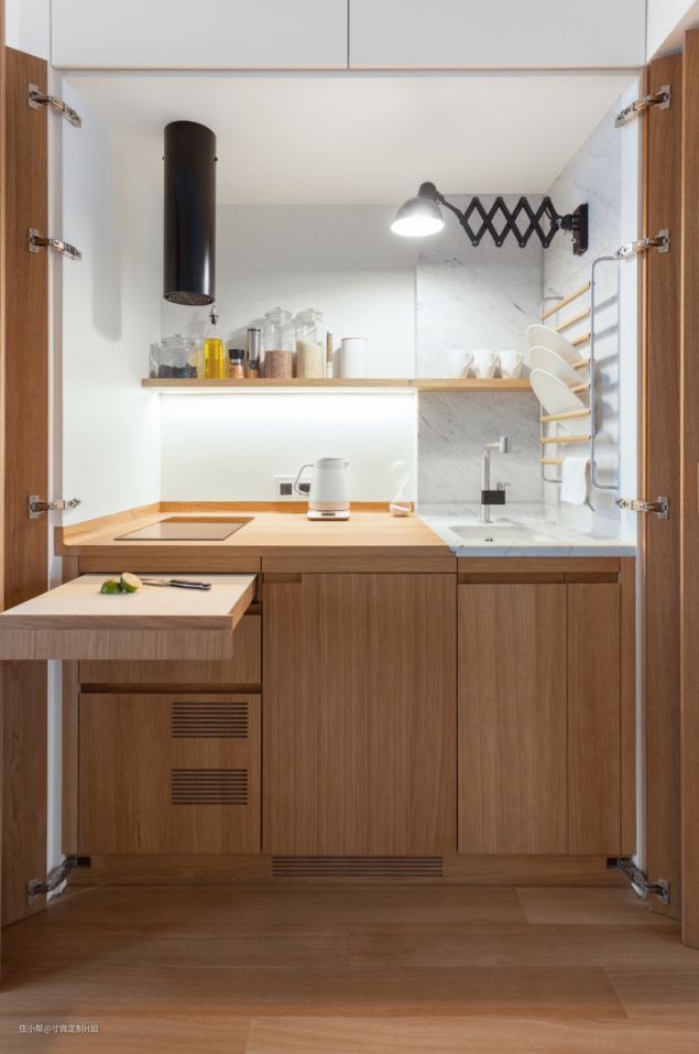 这位业主就是这样,用一面原木收纳柜把厨房也隐藏在内,打开门就是一个人的烹饪空间,关上门看起来也很干净整洁,原木的质感为一个人的生活增添了更多的温馨和幸福。