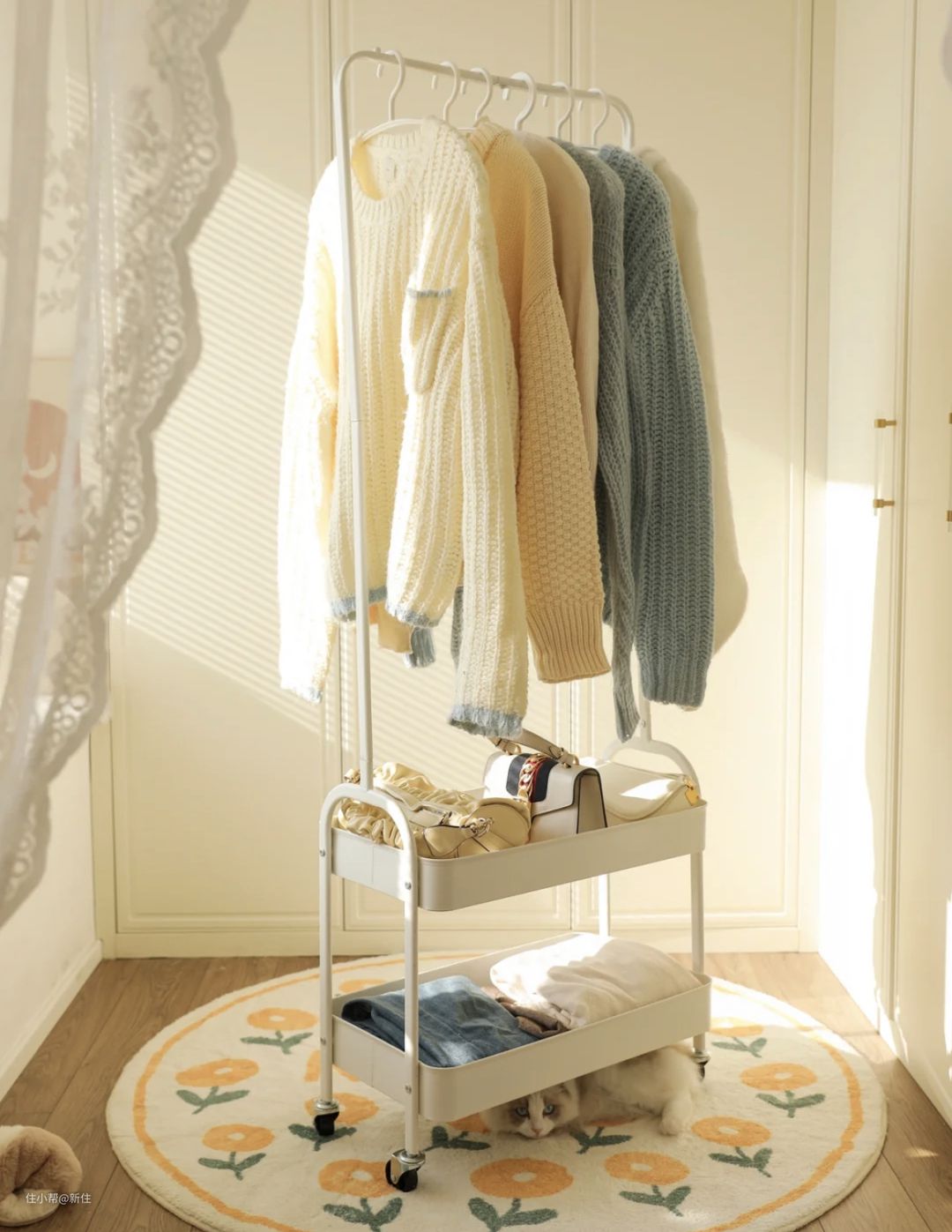 以前她的隔夜衣、睡衣是堆在床角的,床上再整理还是觉得乱,后面用了这个收纳架,不仅是为了收纳衣服,还有包包、一些经常用的小件,也放在上面。
