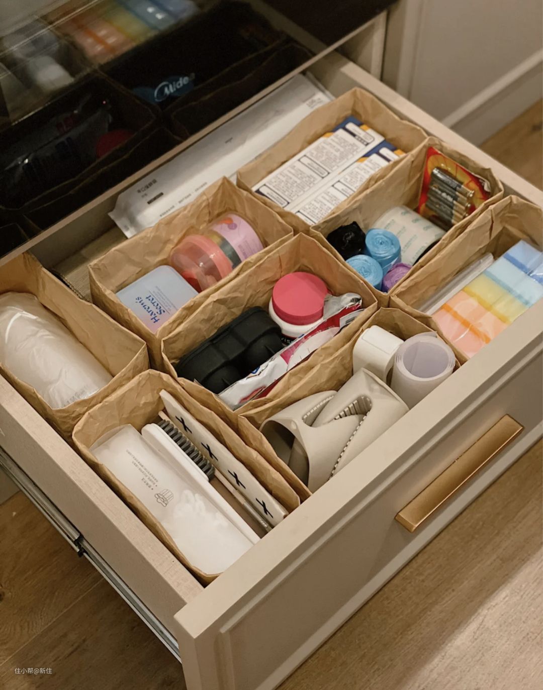 她还特意叮嘱我说,这种分隔板收纳,是挺好看,但没有牛皮纸袋灵活,还有一个弊端,就是剪裁的时候尺寸得卡准,不然放在抽屉里会摇晃。