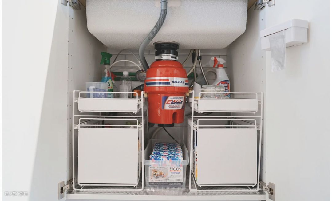 她是用了两个水槽下的收纳架,左右各一个,刚好把阻碍物错开。
