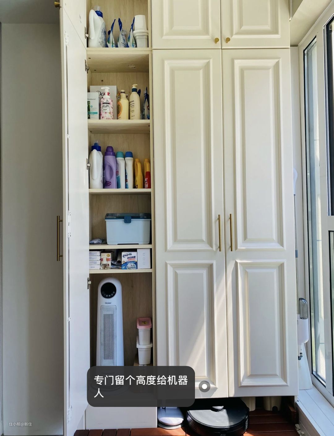 闺蜜说,不仅是给扫地机器人安的家,还有拖把、拖把桶难以避免会有水,如果柜子封到底,水汽不能及时蒸发,柜子会变形、发霉,而且拖把也容易捂出味道来。