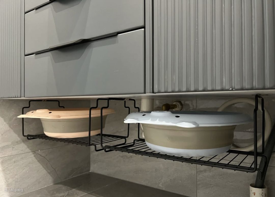 而闺蜜家的脸盆,同样是放在吊柜下面,但是她的是悬空的。