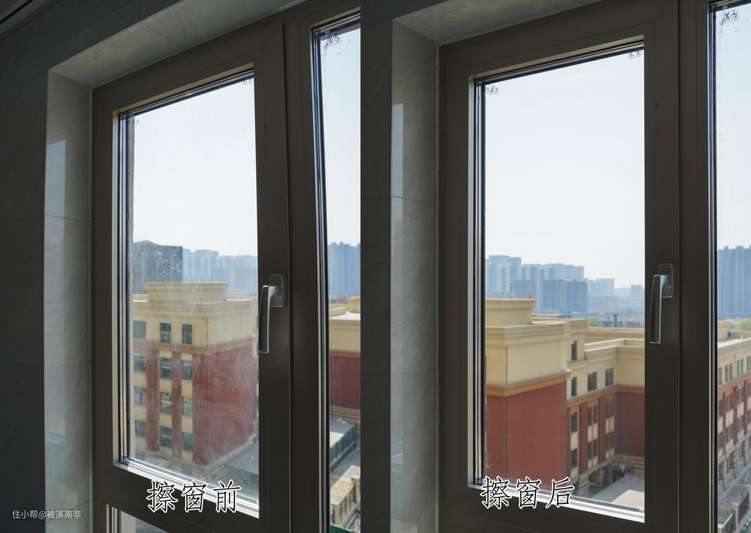 一遍干擦加上湿擦之后基本可以完成玻璃的清洁,对比擦窗前以及擦窗后可以看出,只要使用得当效果还是挺不错的。