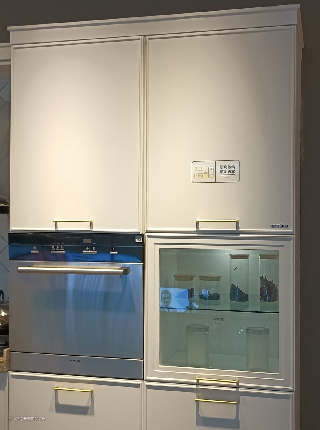 橱柜高柜嵌入电器与玻璃柜,打造中西厨结合,同时烘焙要用的工具及材料就在西厨上下方的收纳柜里,玻璃柜则让常用品一览无余,增加美观,拿取也很方便。