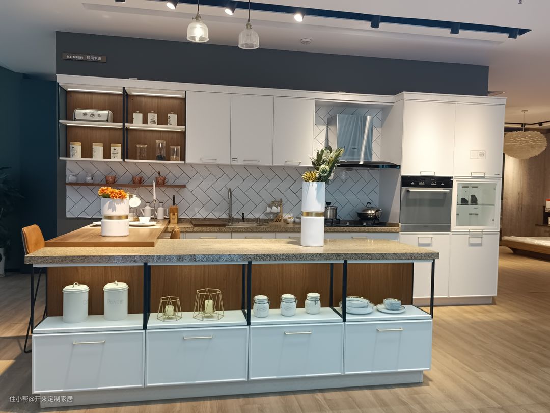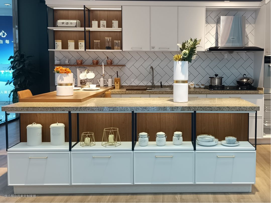 空间格局上开放式设计U型带岛厨房,一字橱柜与岛台双排之间加入移动餐桌,解决传统厨房功能单一、多人下厨拥挤等问题。
