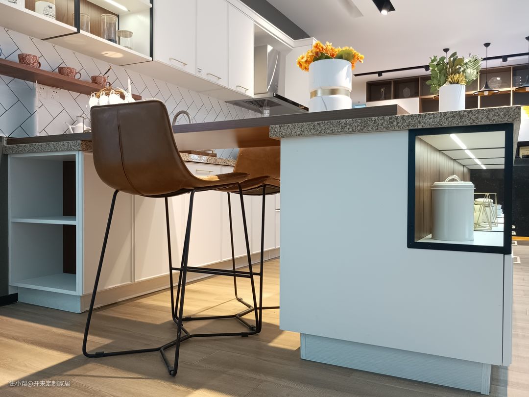 移动餐桌打造厨房休闲区,搭配高脚椅时尚十足,橱柜吊柜开架设计兼休闲区餐边柜,钢架下方挂墙隔板增添开放式收纳的装饰感。