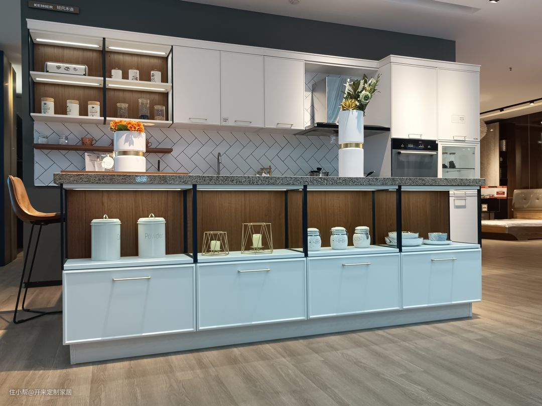 橱柜地柜设计侧开架,适合休闲区藏酒储杯,满足物品上展示与下收纳,让厨房整洁大方,充满意趣与氛围。