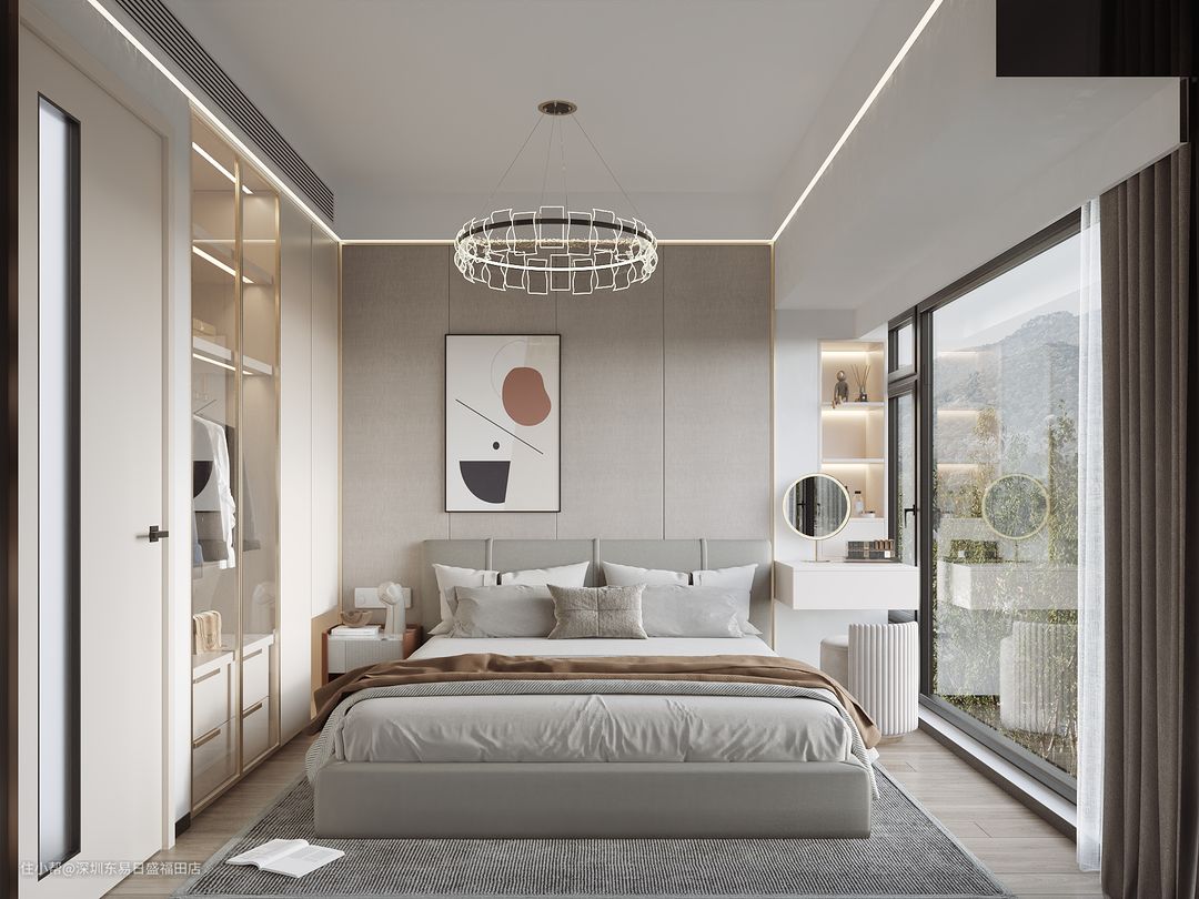 主卧:主卧使用浅色系的米黄,简单的床头背景墙,无装饰纹理的衣柜,搭配黄棕色的木地板,使得整个空间干净且整洁,而且卧室的大飘窗,可见塘朗山的风景,早晨打开窗帘印入眼帘的风景,能使人心情愉悦又轻松。