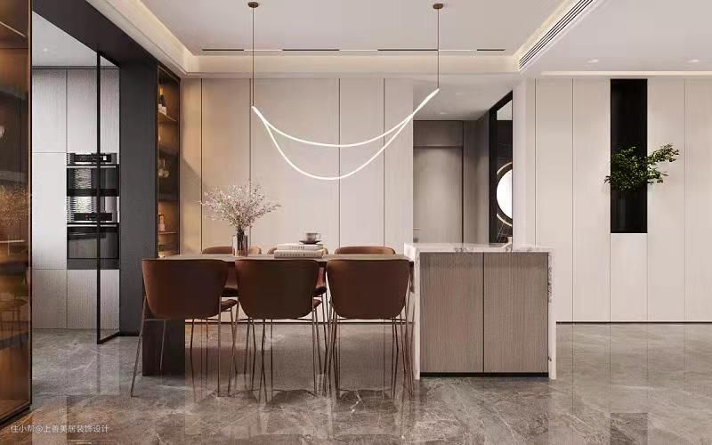 餐厅采用餐桌岛台一体设计,餐桌直接采用石材定制,满足六人同时就餐,岛台为了石材餐桌的承重,做了柜子收纳,一方面承重,一方面收纳各种零碎;整体拉伸视觉,满足功能同时还让动线更加合理。