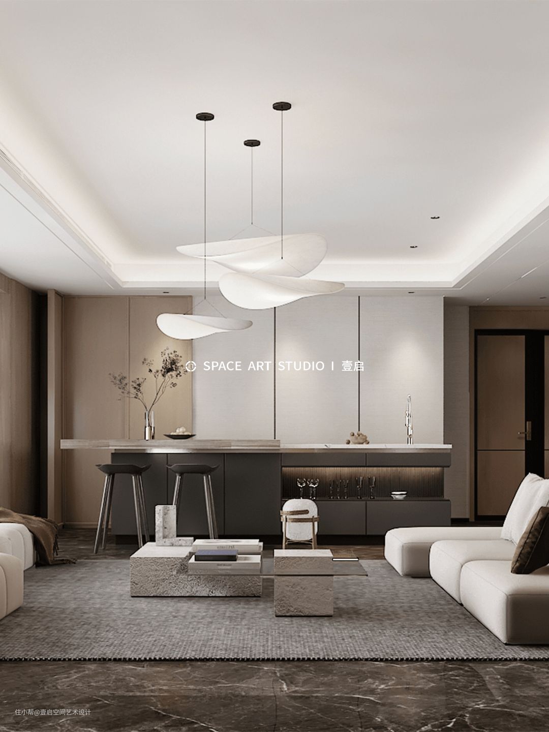 客餐厅一体,在整个公区的设计上,我们选择将舒适“最大化”。白色大理石岛台搭配黑色岩板餐桌,操作+料理+收纳+用餐一举多得,是餐桌也是酒水吧台,舒适最大化的同时也让功能得到最大化。靠餐台打造一排一柜到顶的隐形柜,原木色与白色相拼接增加空间层次感的同时,也保证了空间色调的整体性。