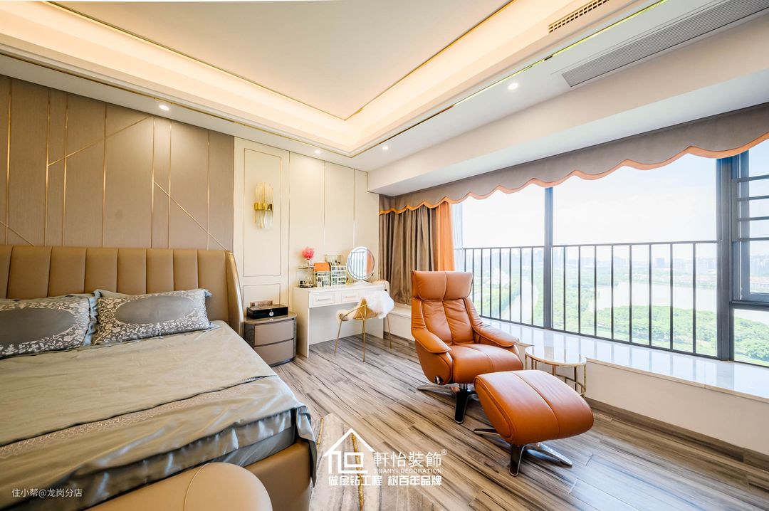 金色的线条搭配棕橙色的窗帘,一抹橙色的皮质靠背沙发让人眼前一亮,局部的活跃色彩让整体空间显得轻奢优雅,使睡眠氛围更显温馨惬意~