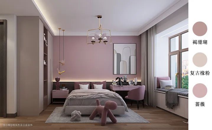 粉色也是有着多种色调的,近期比较火的是藕粉色,更不像单纯的粉色那样女性化,搭配一些复古色调的家具,可以营造出更有格调的感觉。