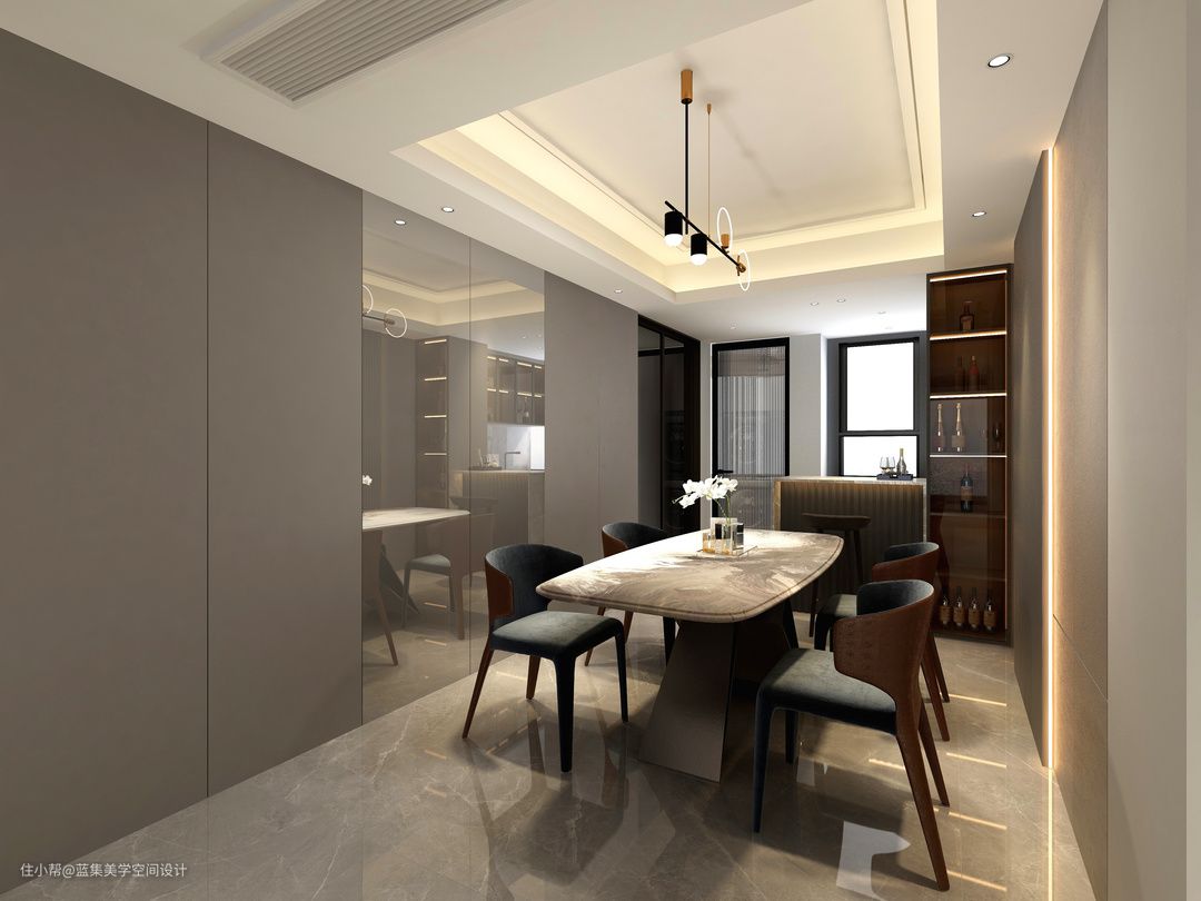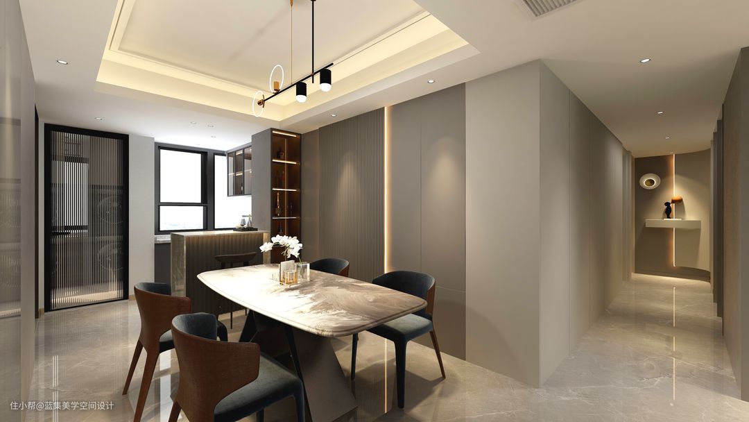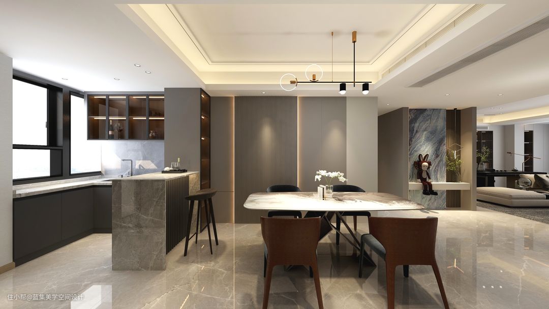餐厅成为了空间的视觉焦点,独特的大理石花纹赋予空间艺术感,简洁的吧台设计,赋予空间大气又精致的现代氛围,餐厅空间满满的仪式感,品尝精致的美食,分享生活的喜悦,营造出一个心灵与自然对话的艺术环境。