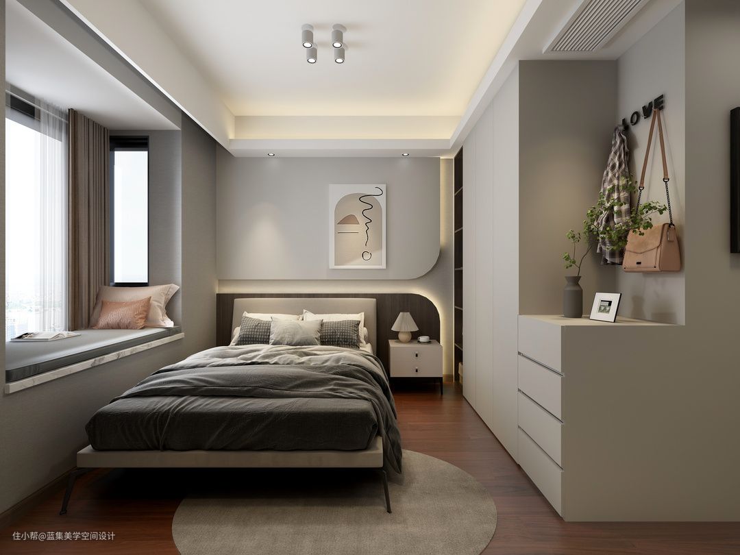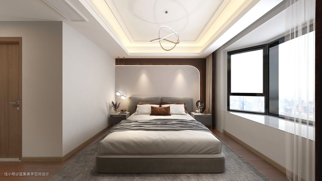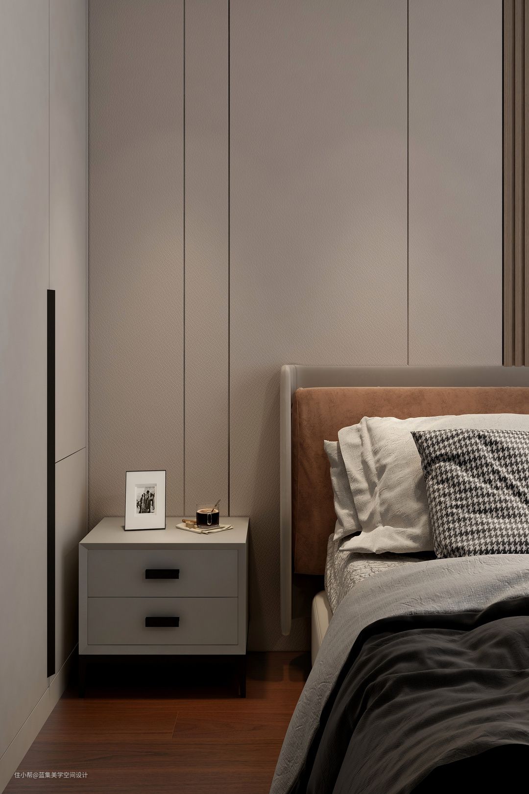 主卧有着强烈的秩序美感,床头背景墙面我们增加了造型简约的白色装饰面板,深色调的加入更具有层次感,用浅色调的柔美来营造舒适的休憩,艺术性和私密性兼顾,带来极致的生活体验。