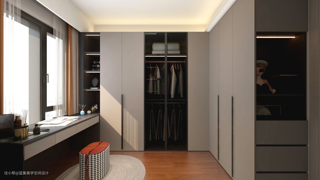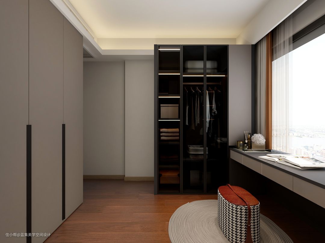 在此定调的基础上,我们再将目光转换至主卧的衣帽间。以实用为上的设计手法里,在对空间做完基础的分工布局之后,再多的用力都是多余。设计师没有用过多的笔触去刻画空间意向上的装饰,而是在基础上进一步挖掘“必要性”,以收纳为主体的线型勾勒,在装点空间的同时,不禁将脚步进一步迈向实用主义。