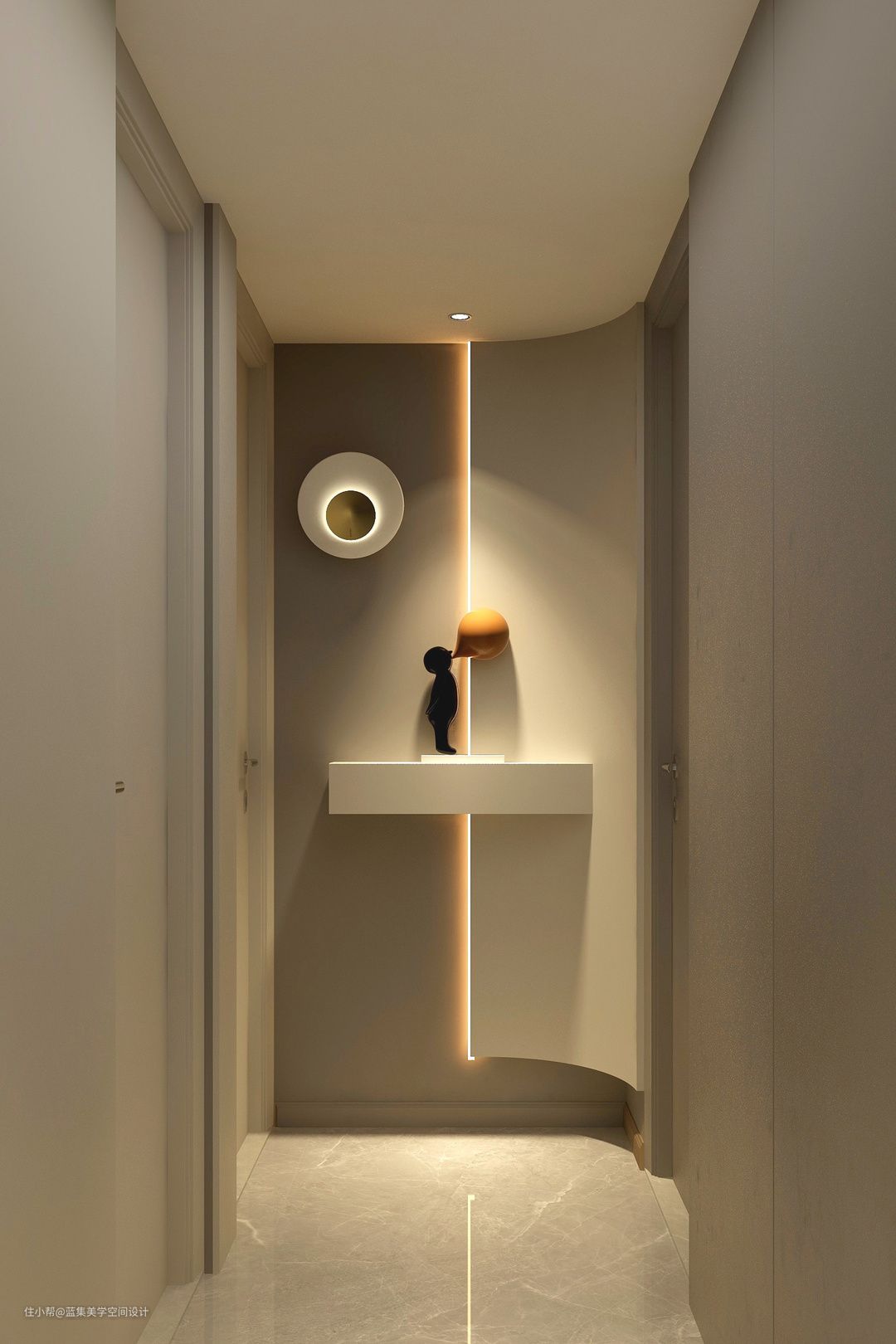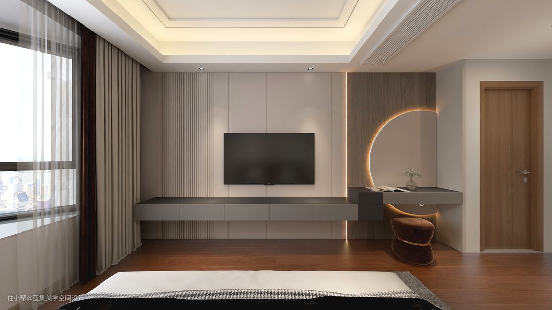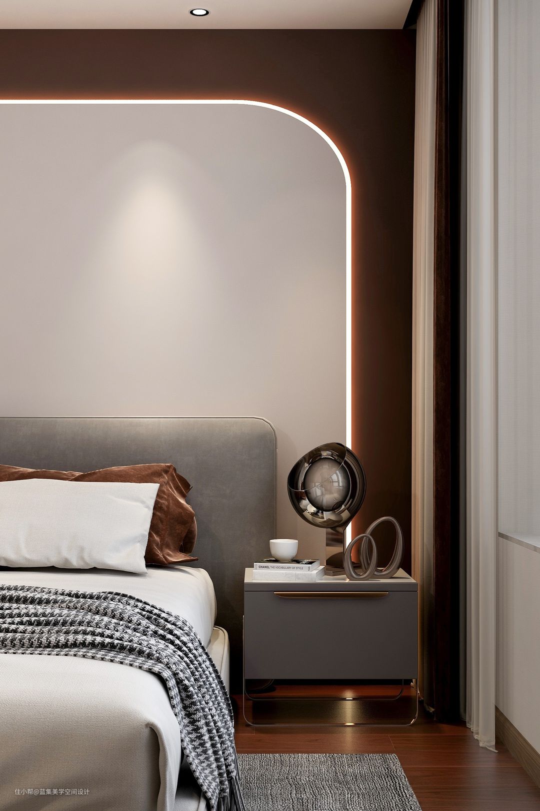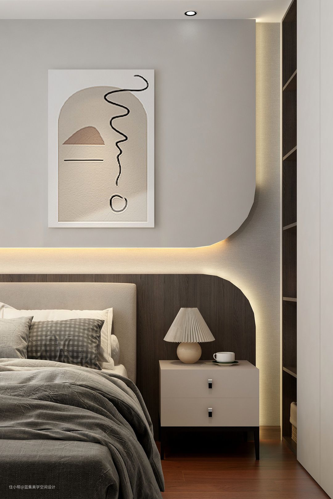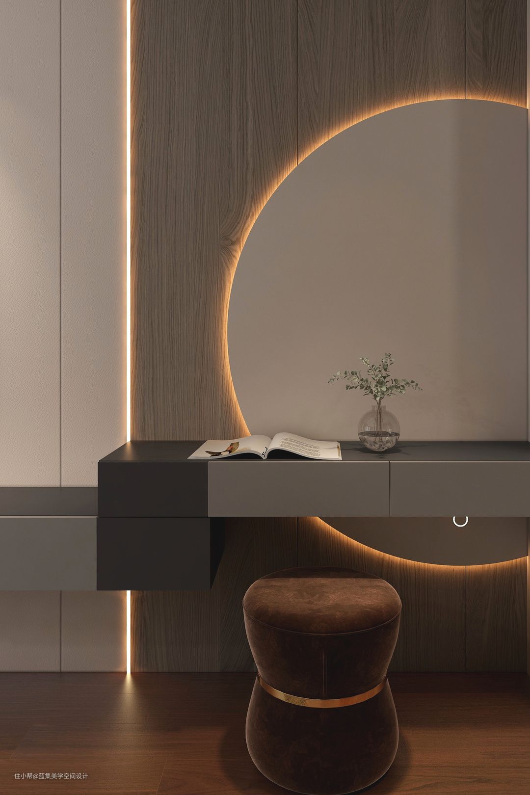 梳妆台的弧形设计,巧妙柔和了空间与家具,显得更加柔美,隐形灯带逸散的灯光营造了柔和温馨的氛围,维空间注入有趣的灵魂,契合倾心精致而又不失自由的生活姿态,表现出独特的艺术美感,满足对品质生活的精神追求。