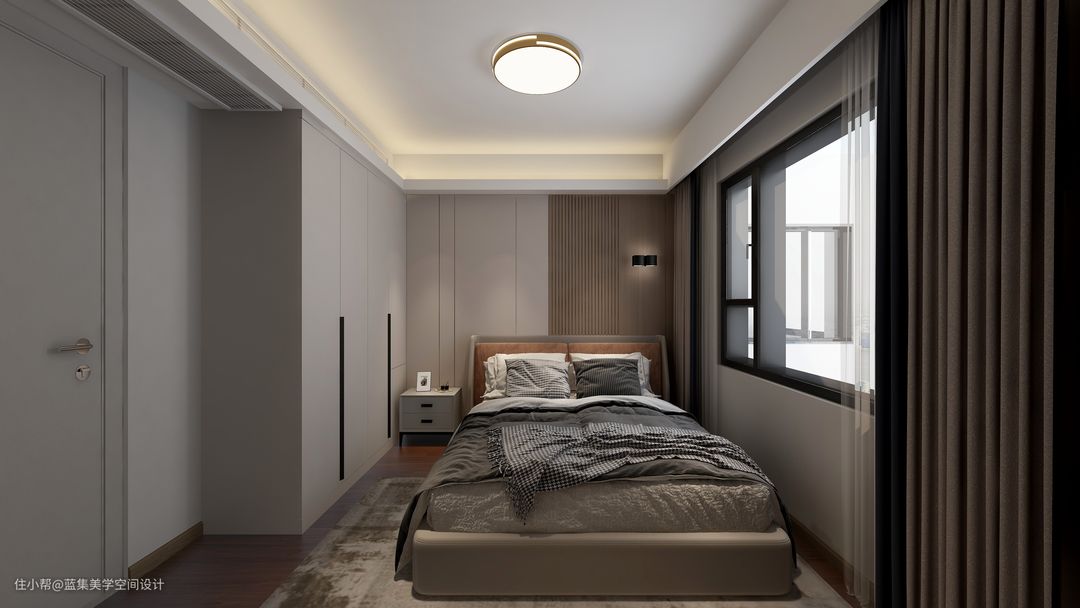 老人房同样采用大面积浅灰色作主色调,辅以咖色点缀,保证了空间的明亮温馨。房间内做了顶天立地的衣柜,并按使用需求细分了不同物品的储物空间。