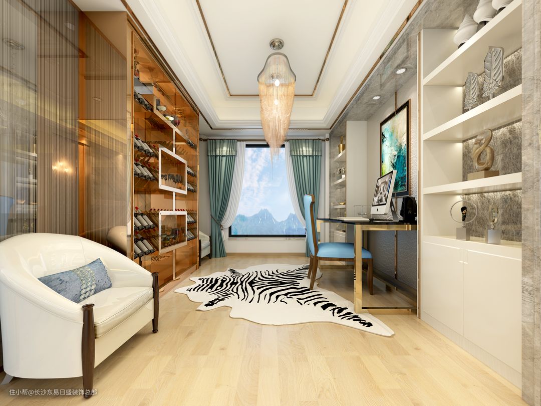 空间兼备书房、休闲、藏酒功能,色彩与客厅的蓝色相呼应,同时金属元素的融入,为空间增添更多奢华之感。设计了一墙的爱马仕橙透色玻璃柜,用于业主收纳红酒。柜子中间独立的小柜格,可以用于存放酒杯。
