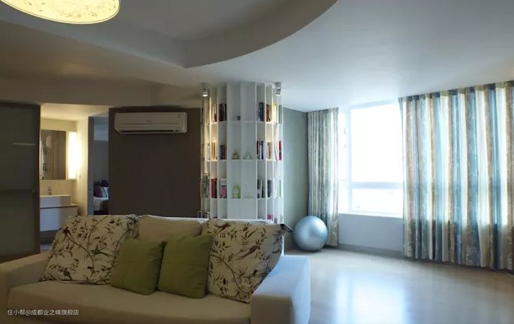 对于弧形角度的大面积客厅阳台,我们可以巧妙的利用打造一片健身区,不用的时候收好器材,同时也能拥有充足的自然光线。