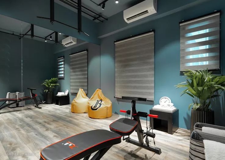 蓝色调的健身房辅以绿植,不同于传统的空间看着过于板正,清新而具有锻炼的朝气。