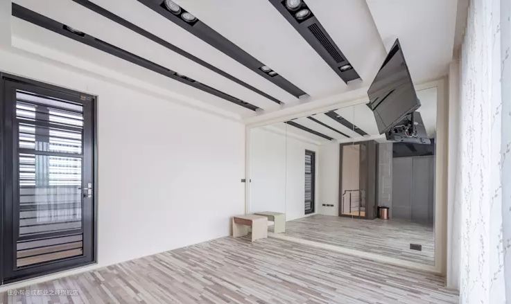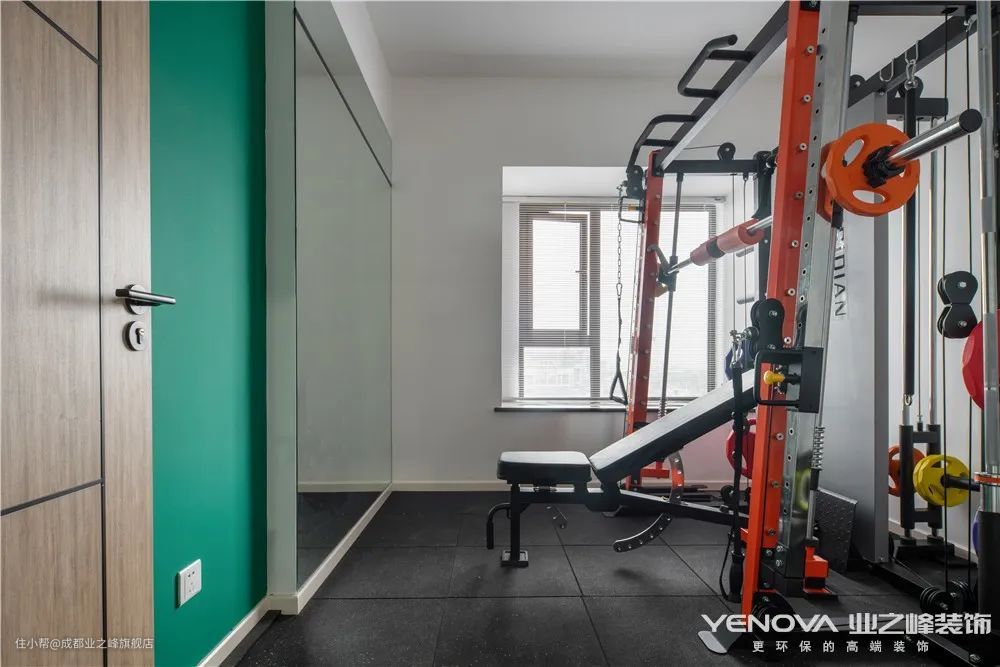 126㎡的小套四也可以辟出一片天地设计健身房,小空间设置大片镜子,方便纠正自己锻炼的姿态,同时也让空间具有视觉延伸性,更为开阔。