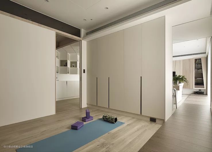 半开放式的健身区域很适合在家带小朋友的女主人在此做瑜伽,小孩在客厅作业或者娱乐,静音的“模式”彼此不会打扰而一呼就应。同时,大面积的柜体为器具也提供了绝佳的收纳。