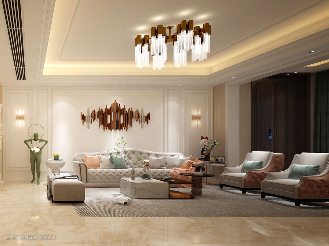 三 、欧式风格。客厅颜色设计整体以白色为主,加上多层吊顶的线条造型与水晶大灯的装饰显得客厅各外的优雅高贵。大理石电视背景墙下的护墙板,它的质感不仅起到美化空间的作用,还能有隔音的效果。