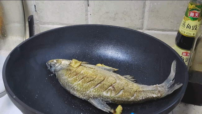 两面煎金黄后,倒入一勺蒸鱼豉油、一勺生抽、两茶勺白糖,然后加水到鱼身一半,放入葱段,大火炖煮。