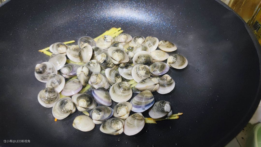 然后放入蛤蜊,蛤蜊的壳比较硬,一般的不粘锅都是不建议爆炒蛤蜊的,更不用说用铁铲了。