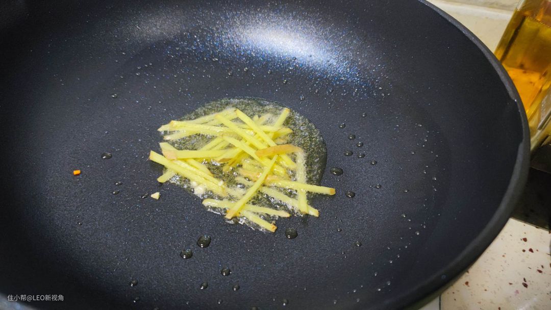 锅中少许油7成热,也就是木筷子放进油里,边上冒小泡了,就可以放入姜丝,炒出香味。