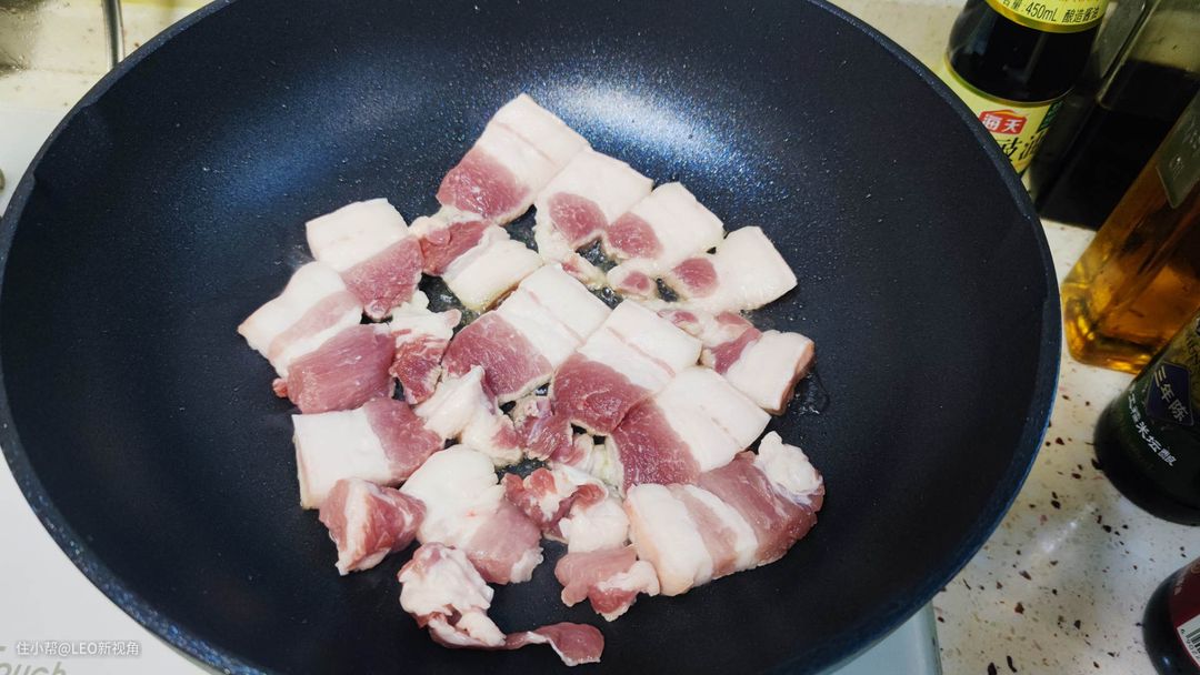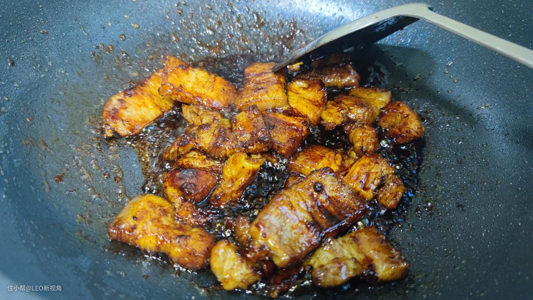 九阳大磨王爆炒不粘锅基本可以满足家里各种煎炒炖炸,比如再来一个LEO家“蜜汁红烧肉”。这里就考验锅子的炖煮能力了。