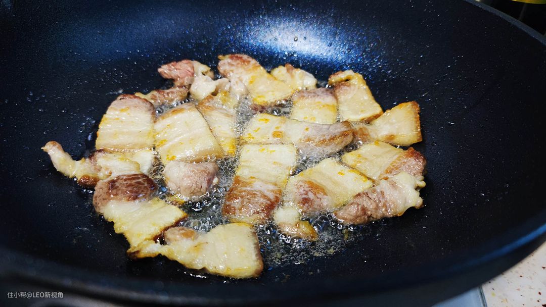 这个煎的过程很重要,不能急,基本熬出一半的油,肉的表面有点酥脆为止。