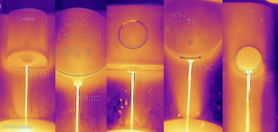 使用热成像测试出水口水流的温度。5台机器分别是94/98/100/93.5/91.6。其中沁园和小米的出水温度是最高的,小米更是达到了100度。这要得益于小米净饮机有个“冬天模式”,如果自来水水温太低,在app启动冬天模式会把水温自动提高3度,老纪这里水温只有15度左右,还是蛮冰的。