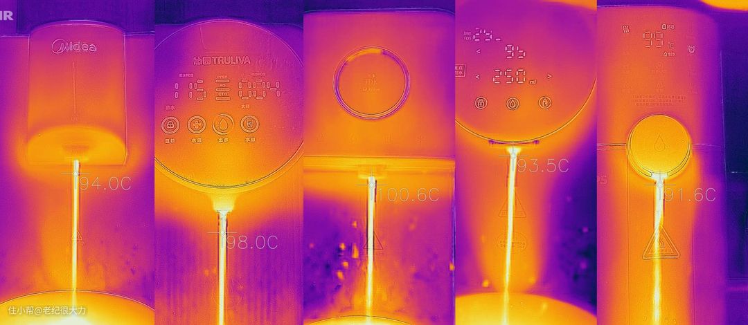 本次测试的内容是把5台机器分别制取最高温度的热水,看看哪个温度最高。这里提一下,5台机器都是即热式的,靠盘绕在出水口的即热加热管以极快的速度烧水,而不像传统净水机是把水箱里的水保持常沸腾,这样降低了耗电量,也避免了千滚水。