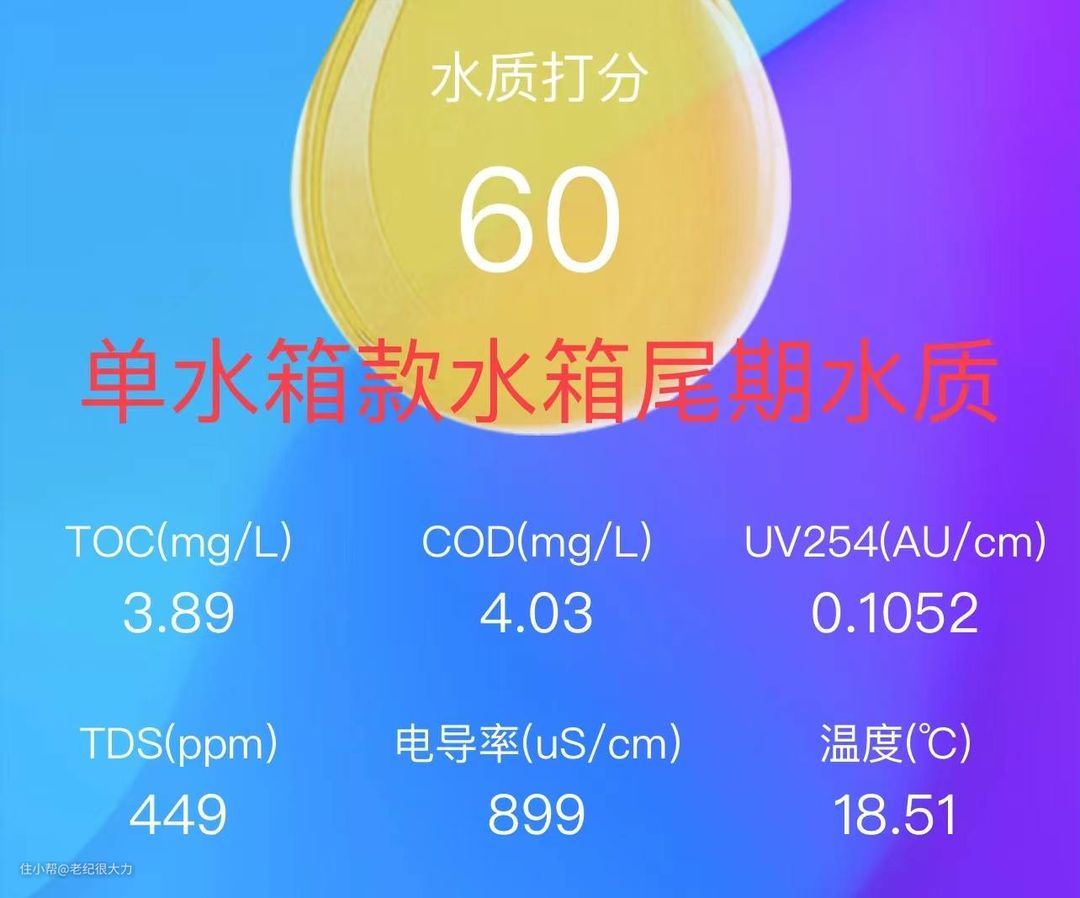 几台净饮机在制水方面都能满足我们的需求,最后顺手测试一下单水箱净饮机内制水到剩下一点水时的水质。TDS飙升到449,另外几个指标也高的离谱。单水箱的净饮机会循环把这些水抽进去过滤然后排出更高浓度的浓缩水,对滤芯的寿命有影响。