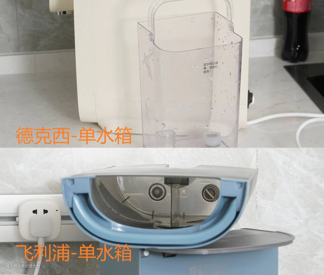 德克西和飞利浦则都是单水箱设计(飞利浦的水箱看起来有一个挡板,其实那个挡板很矮基本起不到作用,废水排到水箱里重新参与制水,容积分别为3L、4L。
