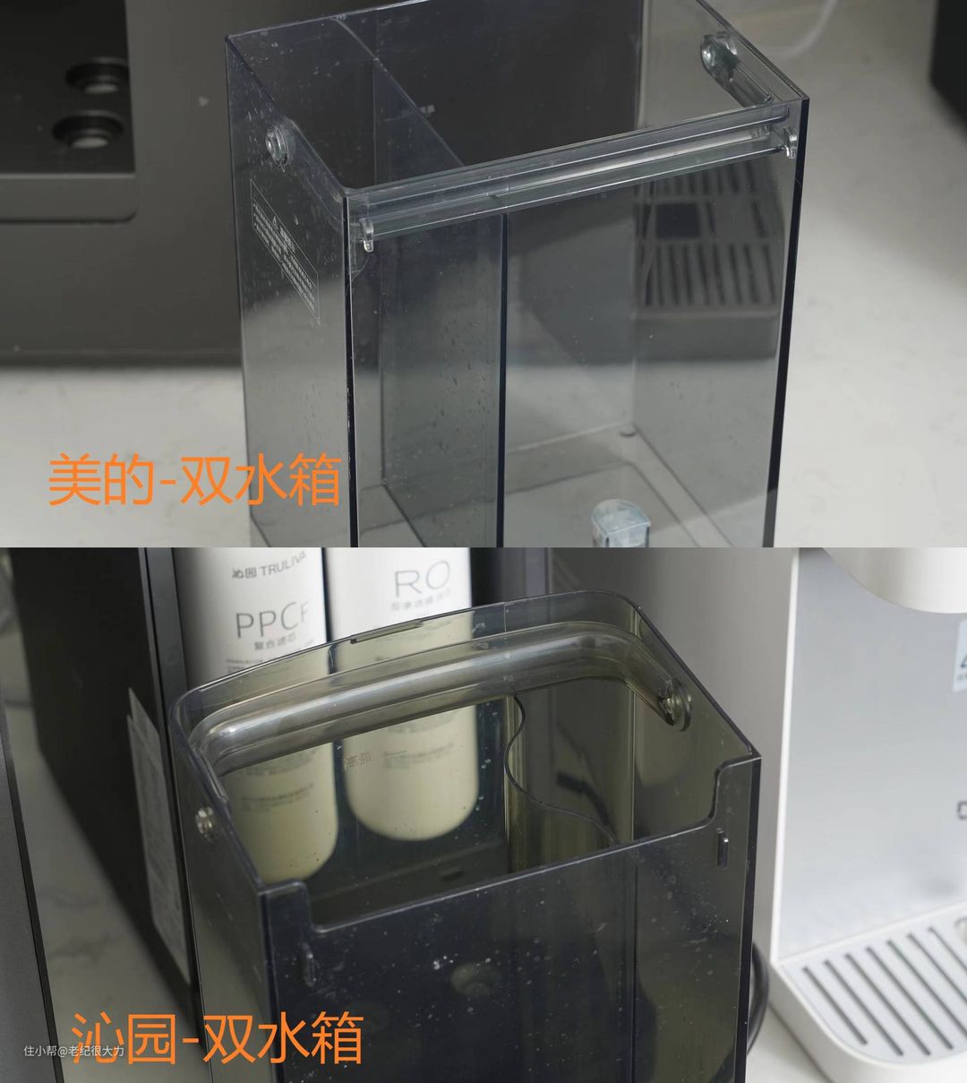 美的采用了双水箱,原水箱容量为3L。沁园也是双水箱设计,水箱容量为3.3L(均不包含废水箱的容量)