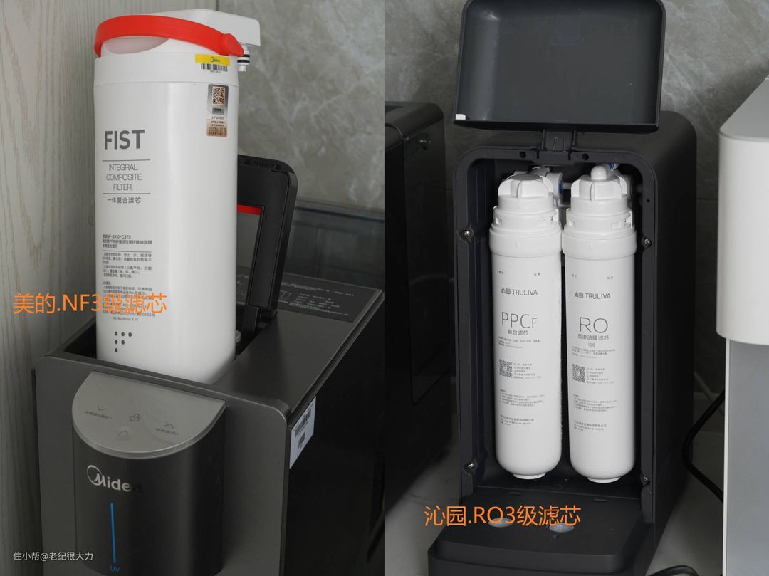 和另外4款RO反渗透滤芯不同,美的采用的是单只的NF滤芯3级过滤,它可以过滤直径为百分之一微米的物质,而RO反渗透可以过滤万分之一微米的物质,所以美的这款略显落后。滤芯每年更换,售价大概300元左右。