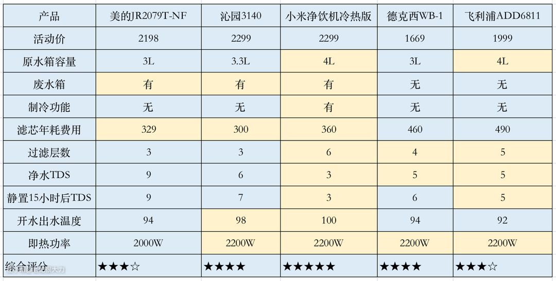从左到右分别是美的、沁园、小米、德克西以及飞利浦。
