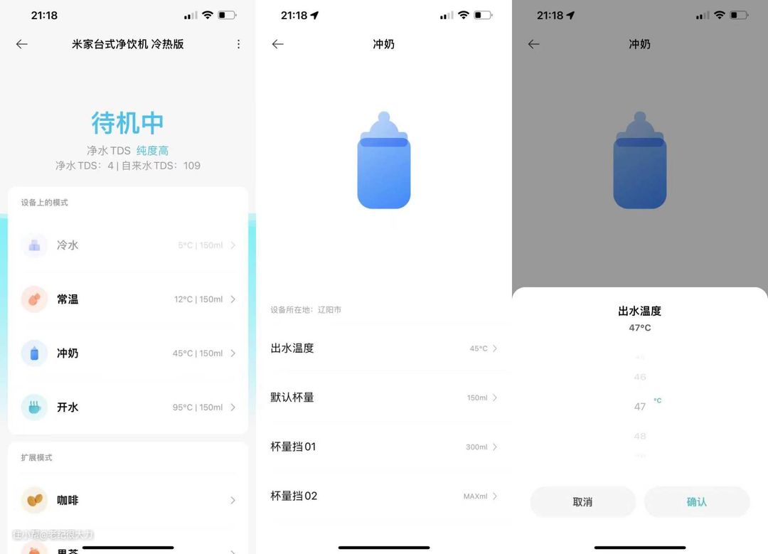 可以在米家app里联网净饮机后,自定义每个模式的温度以及调整不同档位的出水量。在app里出水温度是以1度为单位可调节的,可以更精确选择适合自己的温度。