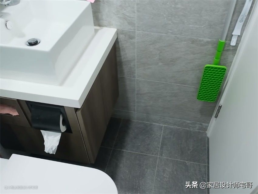 卫生间不大,但是也做了干湿分离的设计,用玻璃推拉门和挡水台隔出的独立淋浴房,更加卫生和干净。