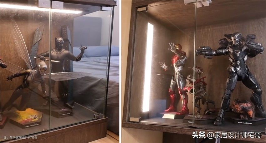 熨衣台下方的柜子则是打造成的展示柜,将男主人喜欢的一些手办放置了进去。
