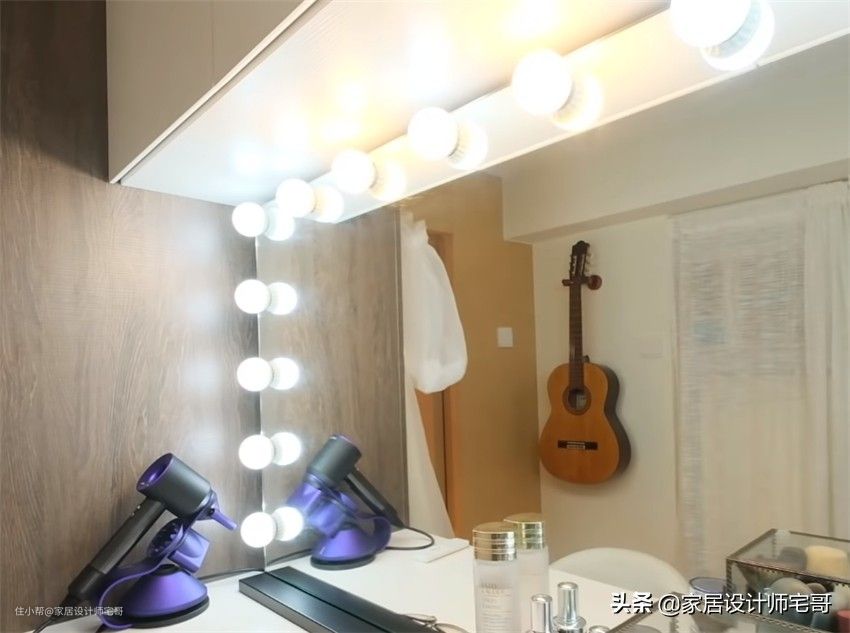 这里面还设计了女主人的梳妆台,镜子旁边全部做了灯饰点缀,很好地增加氛围感。