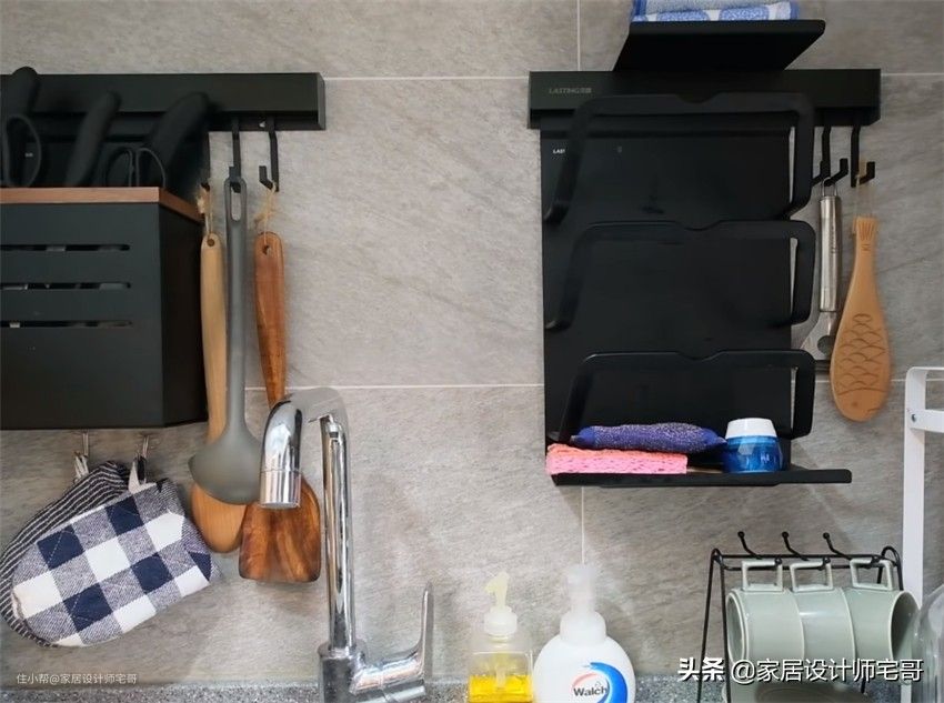 厨房中间的墙壁上放置着各种各样的收纳架,一些厨房用品就可以进行很好的收纳了。
