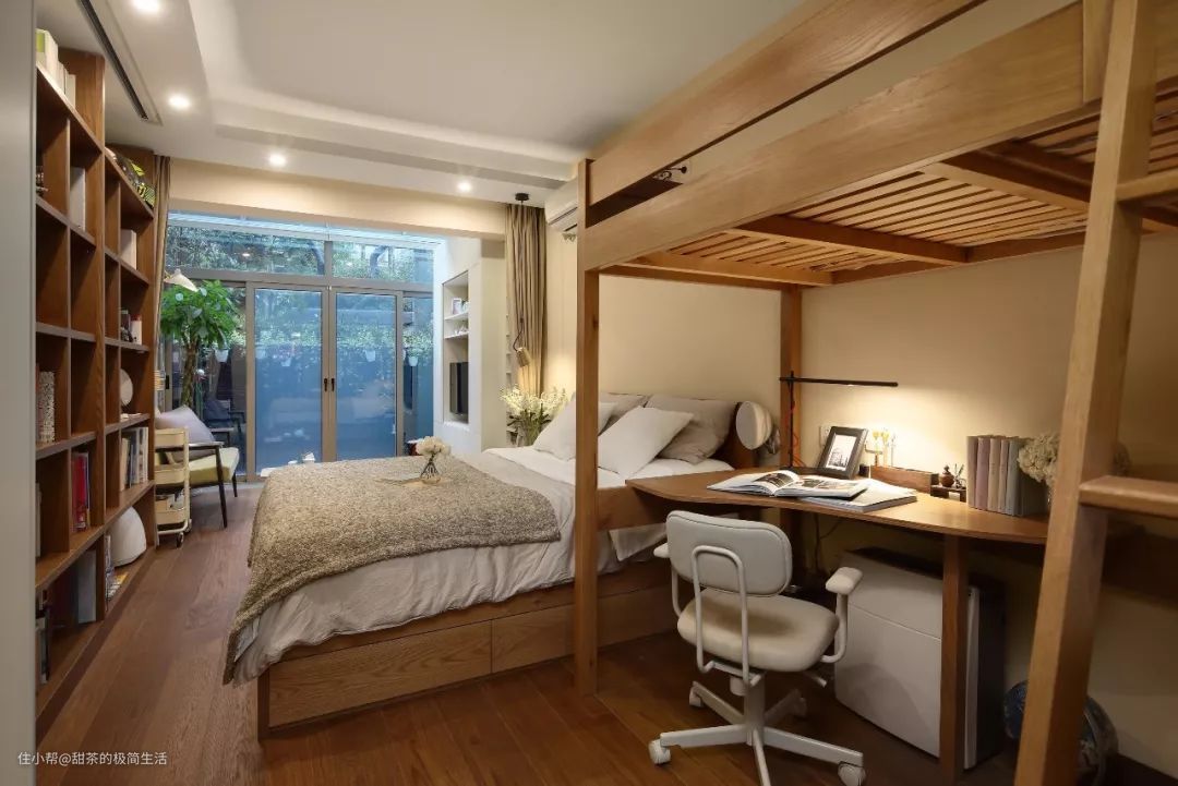设计师在进入主卧后的右手边,定制了一个高架床,下面的空间刚好用来摆放书桌,充分利用了垂直空间,完成实用面积的最大化。
