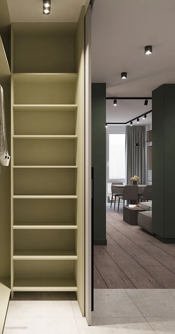 在没有玄关的情况,利用增加玄关柜的设计,创造出一个假的玄关,化解进见厅的尴尬,在入户门进入客厅过渡区域放一个鞋柜,不仅当作玄关作用,而且也非常的方便实用,一方面化解了进门见厅的尴尬,另一方面解决了鞋柜的摆放问题。