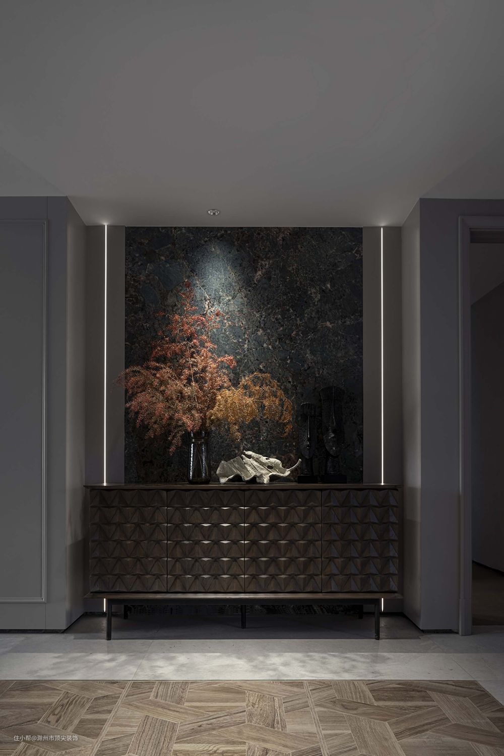 也不一定要把玄关装饰的重点放在入户的地面上,把入户门附近的墙面,粉刷下做个造型,或者摆放点运势宝器或者工艺品,打造一面最美入户背景墙,同样可以惊艳众人,转移进门见厅的尴尬,有创意的玄关背景墙,让焦点锁定在墙上。