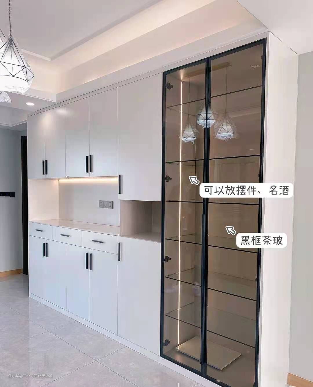 看看这种餐边柜很占位置,占地面积大,家里有小孩的容易磕磕撞撞。我们可以把餐边柜往傍边装修,视觉上空间就大了许多。