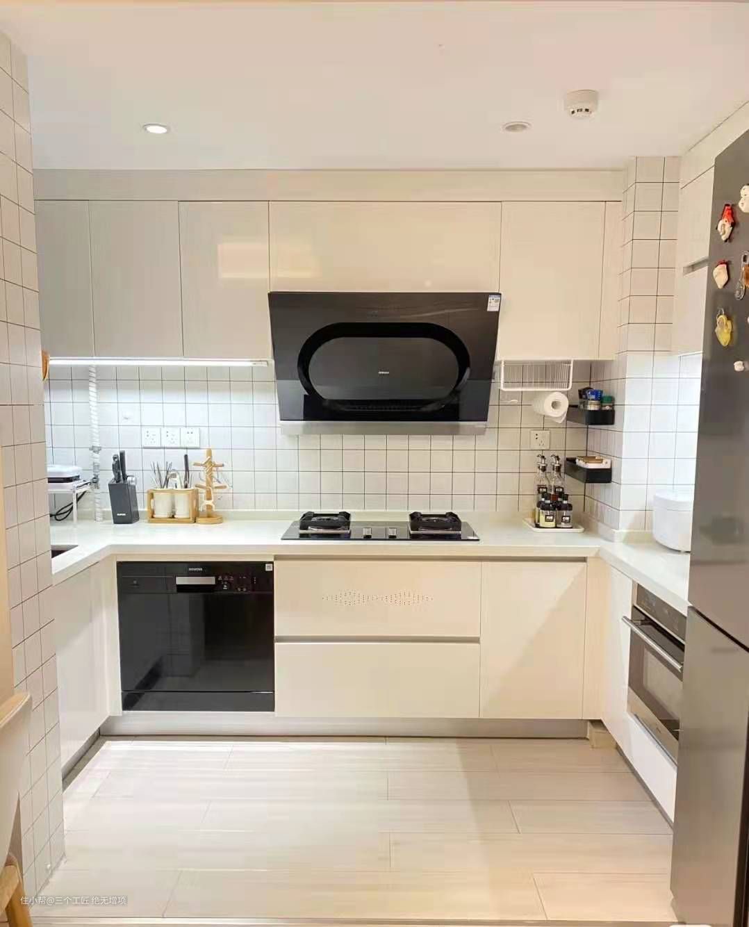 这款柜门虽然很好看,但是你仔细看,我们平时做饭的时候都是油脂,会擦的到处都是,这样显得很脏。而且用抹布也不是很好的擦干净。可以选双色面板,颜值也很高,大家在装修厨房柜门的时候,耐脏还好看,简洁大方。